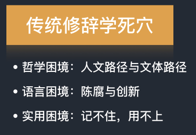 不同于以中国为代表的人文路径「修辞以立其诚」,和以西方为代表的文体路径「修辞以立其真」,本课提倡的是第三条路径——修辞以立其感,忽视传统修辞的分类与意义,鼓励以语言感觉为依据,用新的目光,探讨出古老的修辞学所不曾觉到的意义。