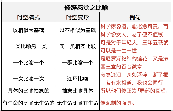 - 修辞以立其感:日本的佐藤信夫发现,修辞是「发现性认识的造型」,可以创造新感觉,点明美的视觉